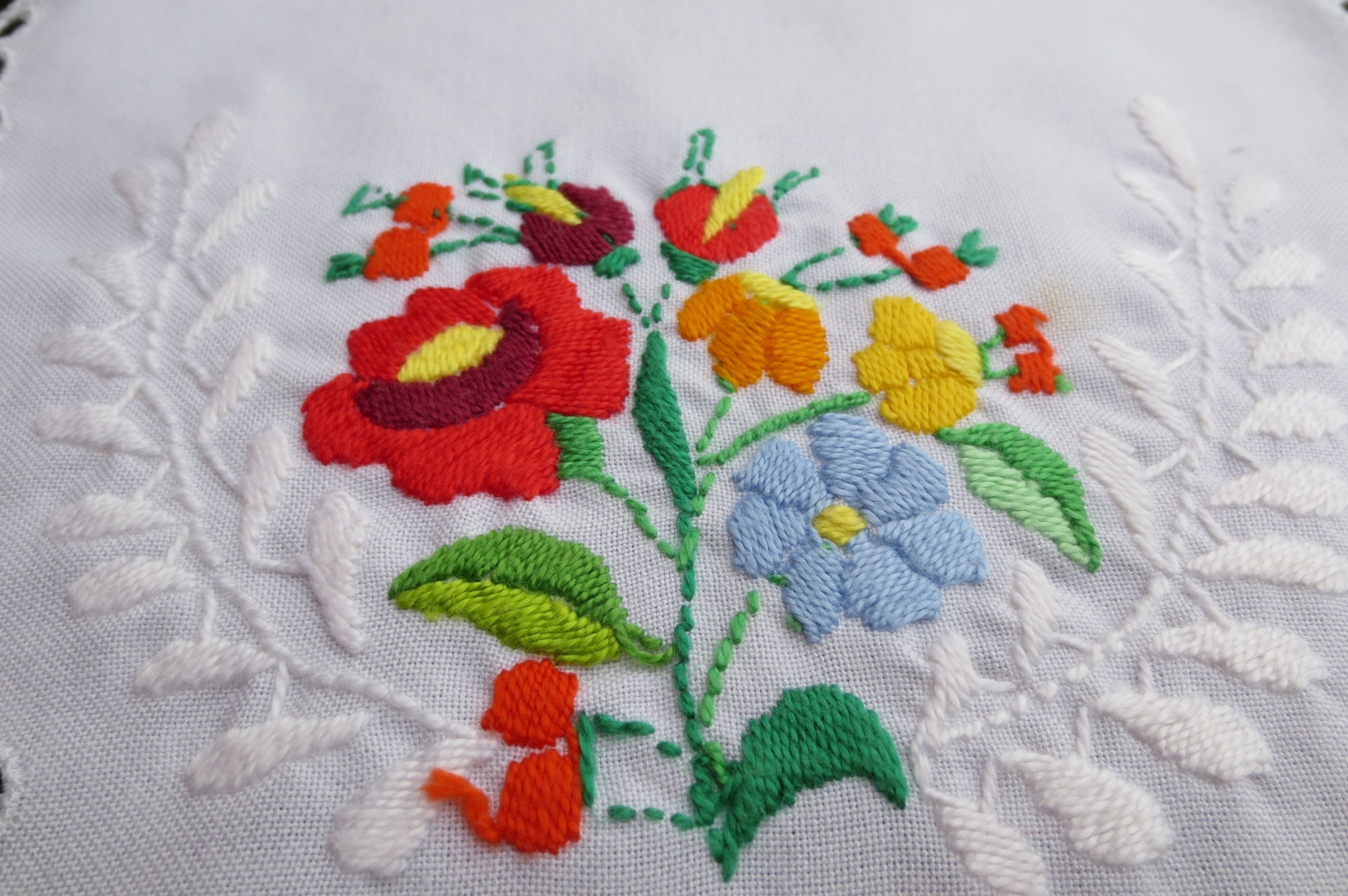 このまま額に入れて飾っても良いですし、玄関先の花瓶の下敷きにするにもOK。白い刺繍の中にカロチャが施されている、手の凝ったデザイン。色柄がとってもカラフルなので、一つあるだけでお部屋の雰囲気もガラリと変わりますよ。