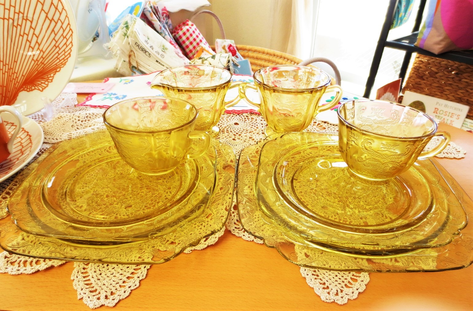 アメリカのインディアナグラス社が生産したこの「マドリッド」と呼ばれるシリーズの食器は、「プレスグラス」という押し型で食器にデザインを施している1970年代のビンテージ品です。透かして見ると繊細なデザインを綺麗にみることができます。
