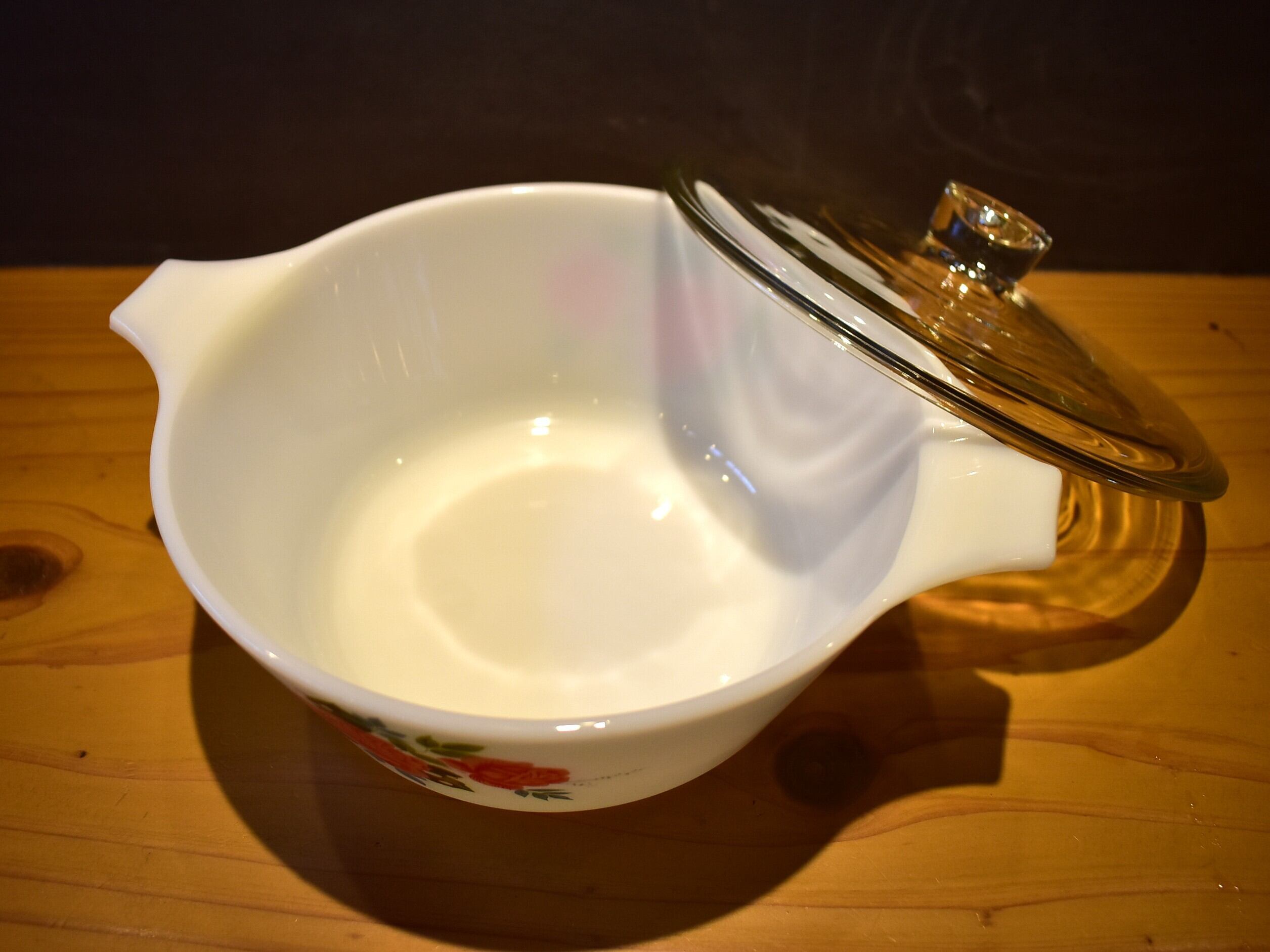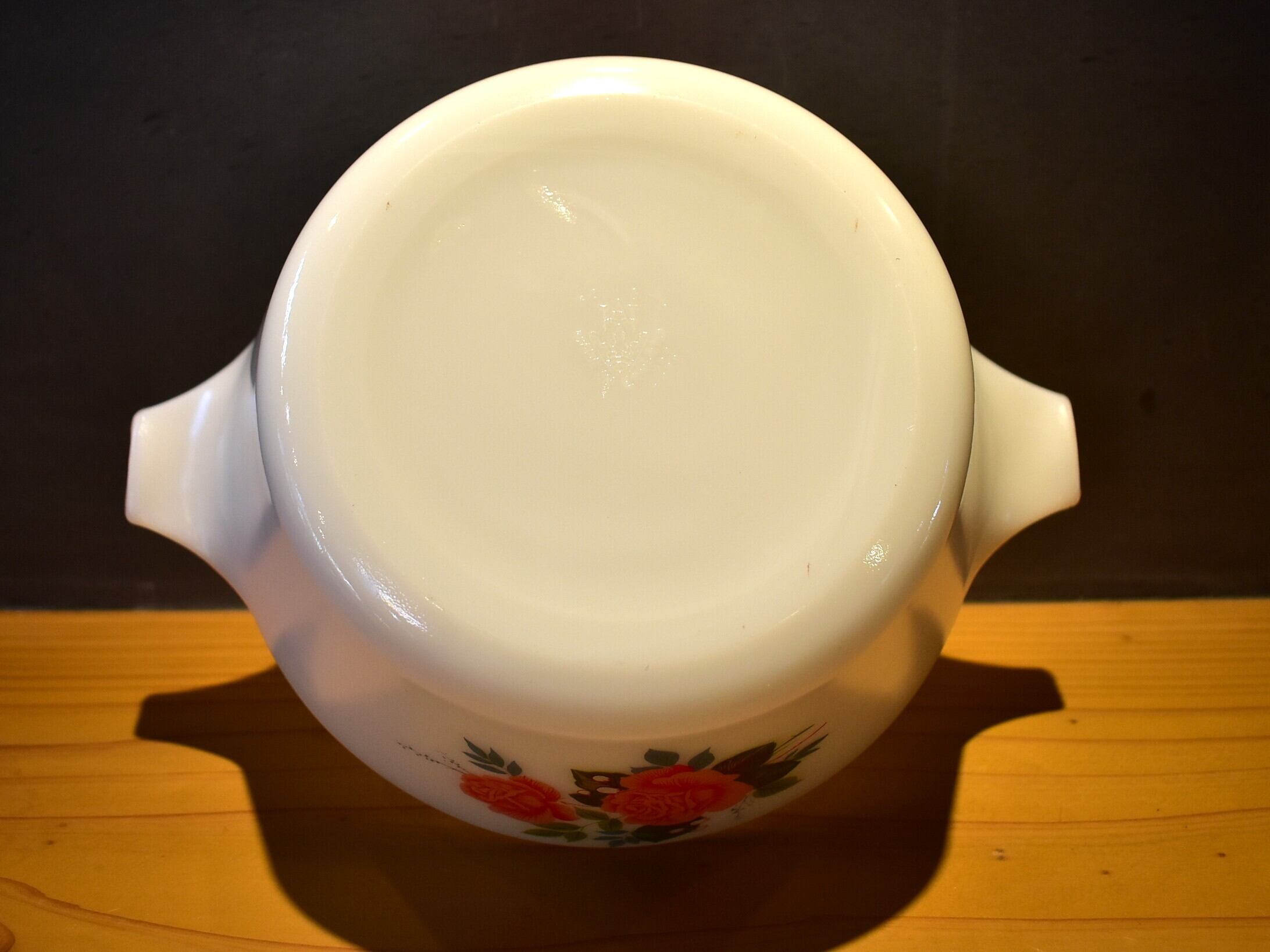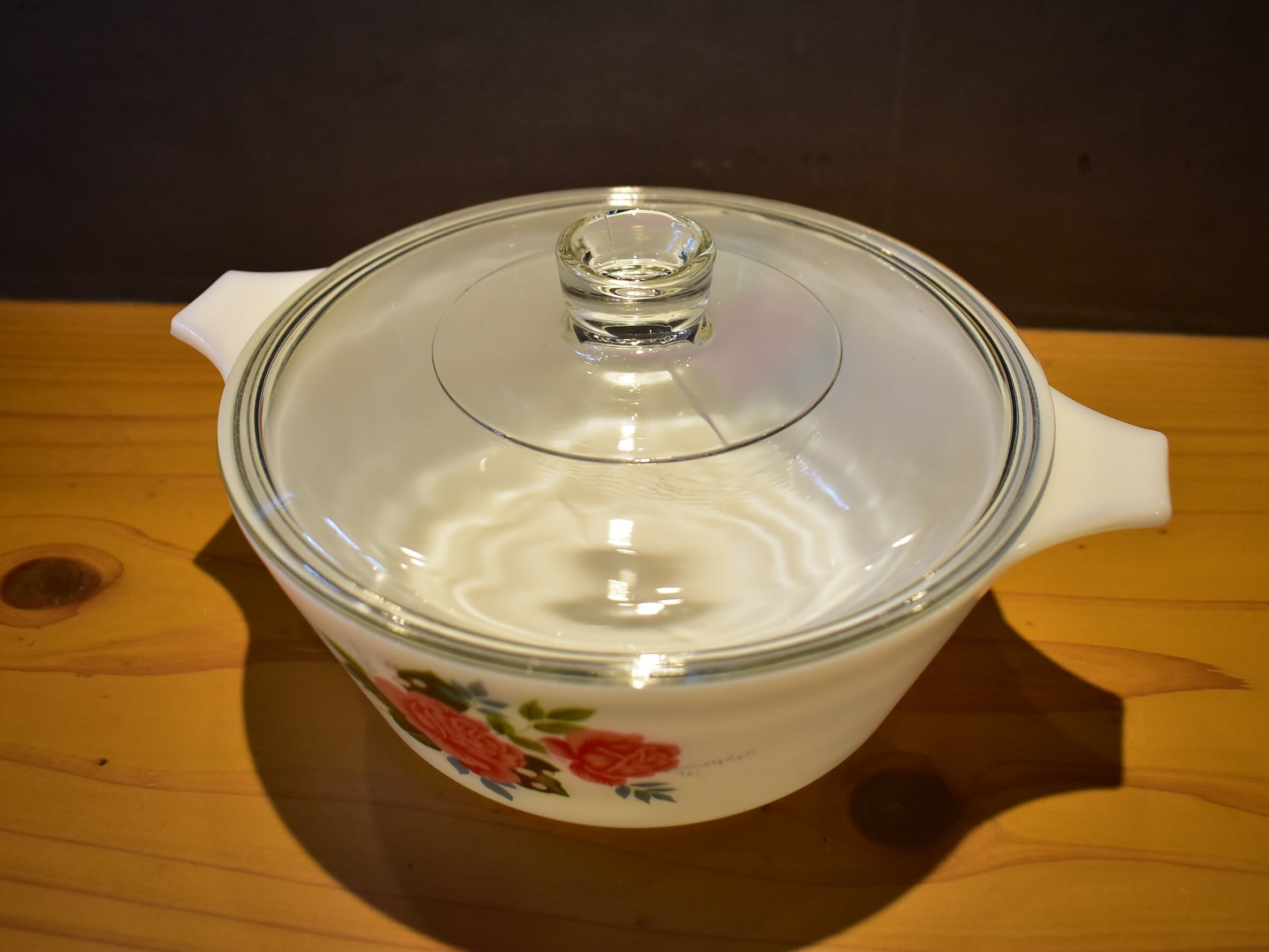 こちらは「コテージローズ」シリーズの深型キャセロールで、蓋の取っ手付き。ピンクとブルーのイギリスらしい色合いが素敵なお品です。1970-73の生産品。