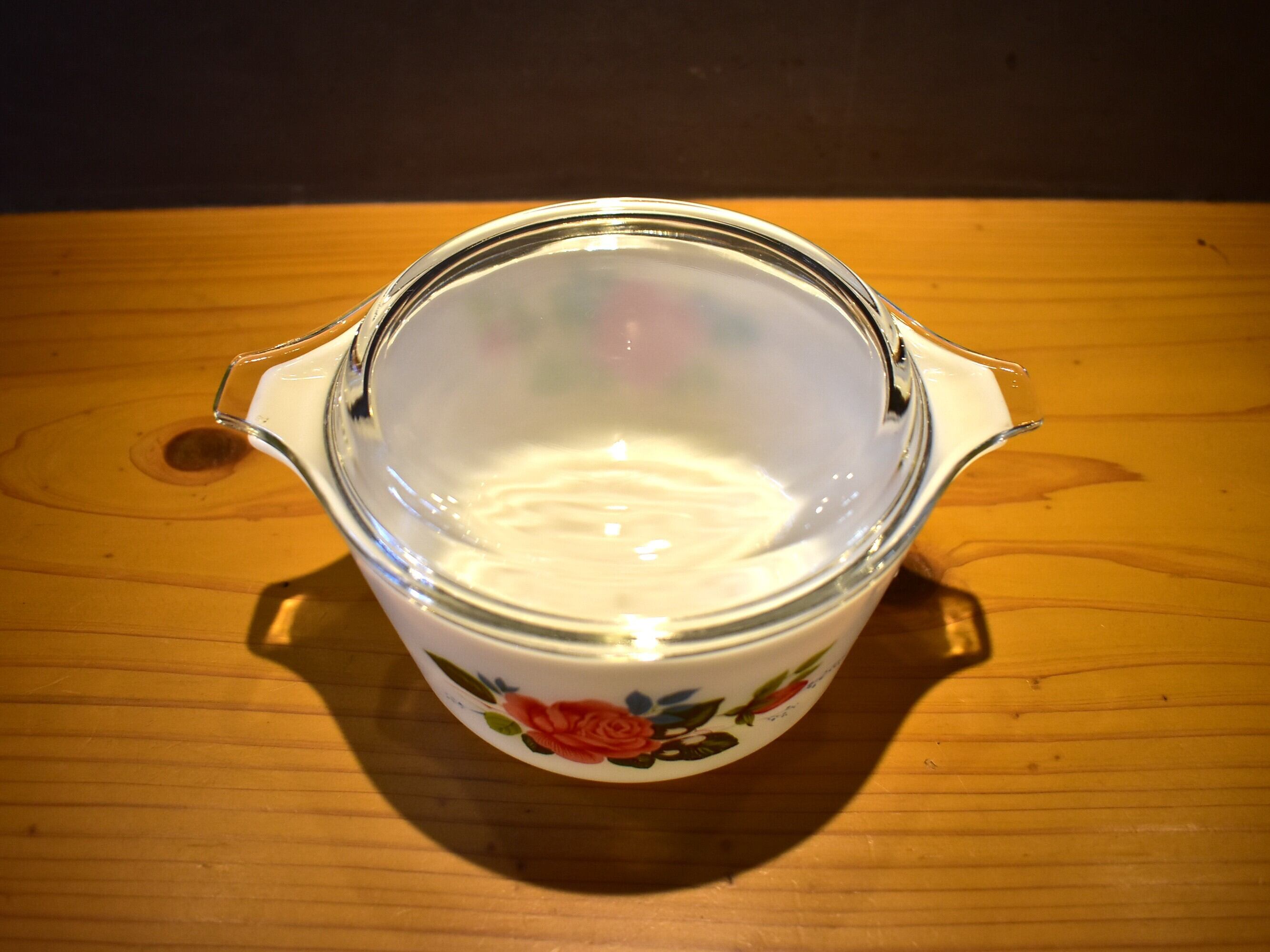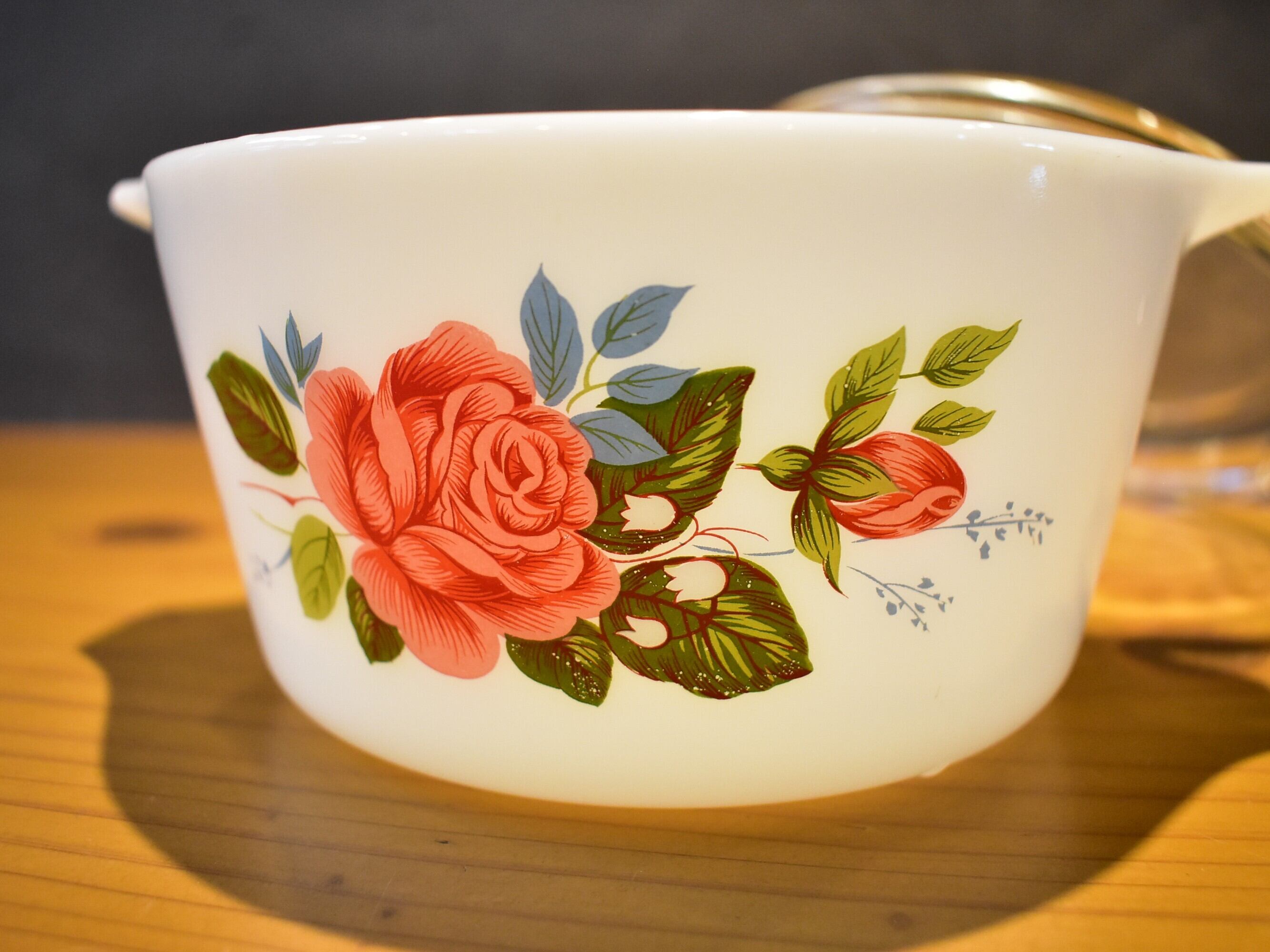 こちらは「コテージローズ」シリーズ、平蓋の深型キャセロール。ピンクとブルーのイギリスらしい色合いが素敵なお品です。1970-73の生産品。