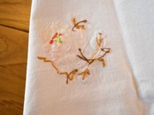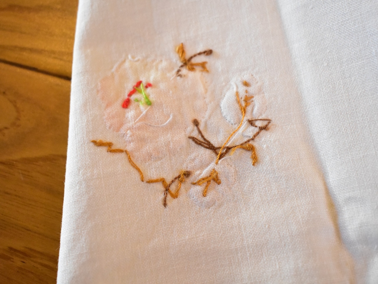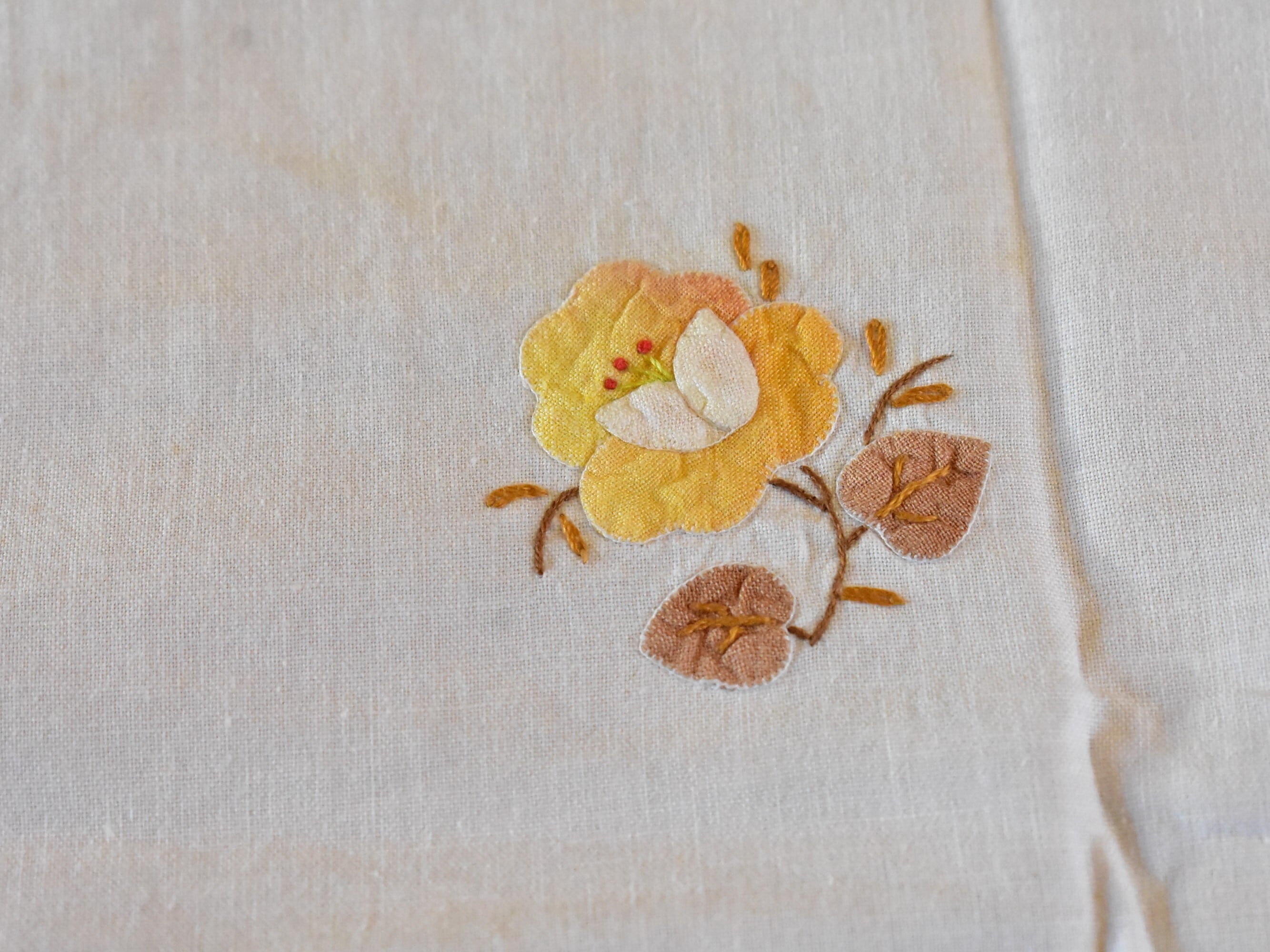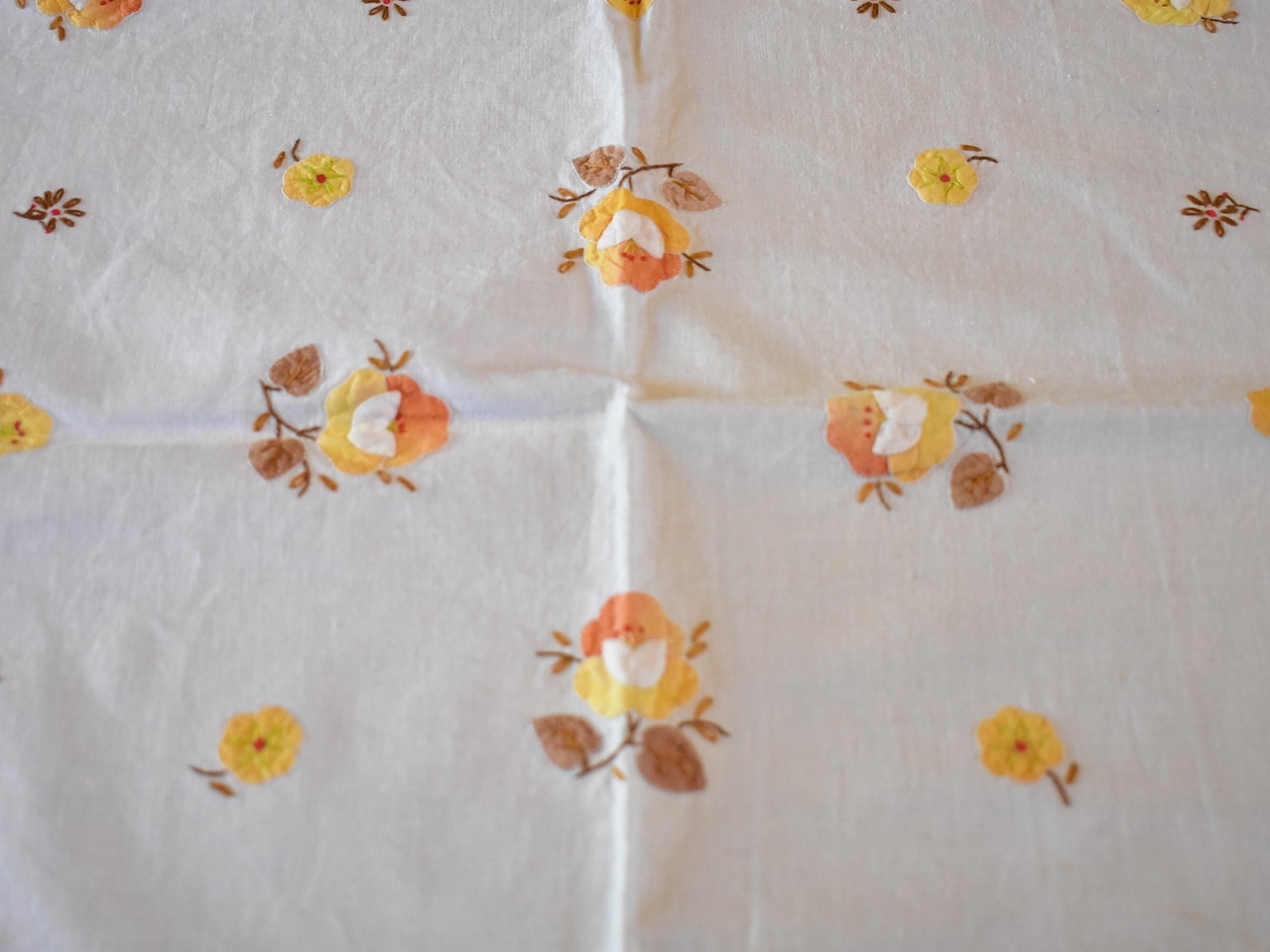 オレンジの花柄アップリケが、秋冬のテーブルを彩ります。布の周囲も同色の糸でクロスステッチされていて丁寧な作りです。