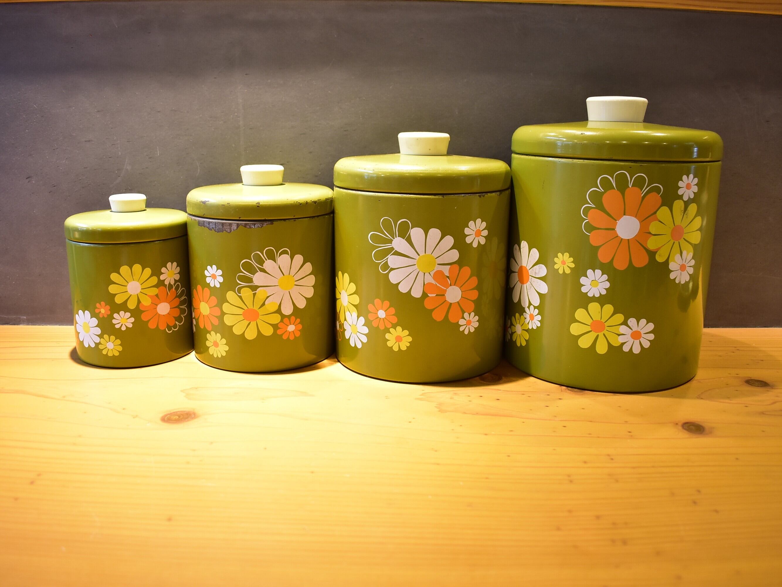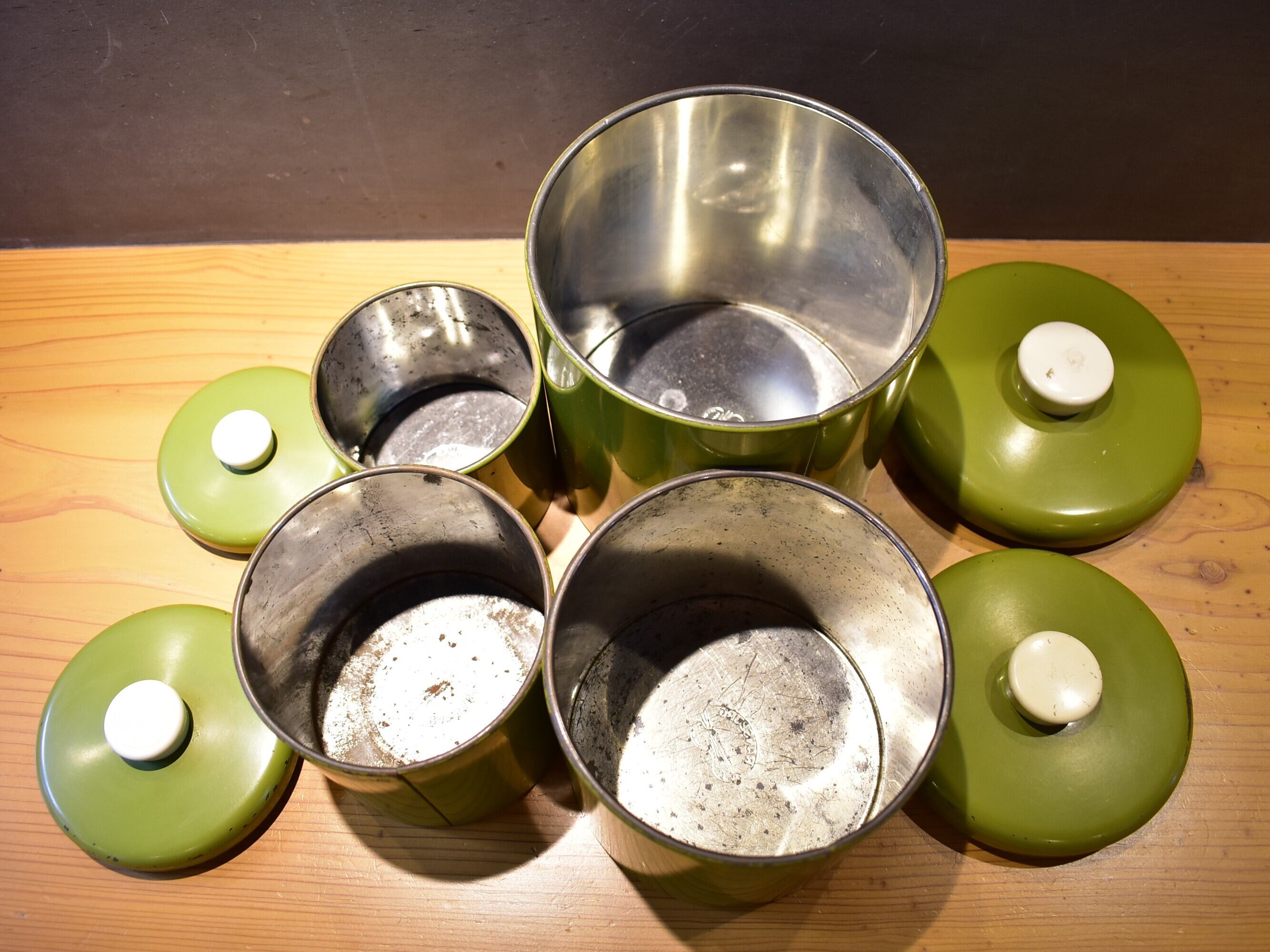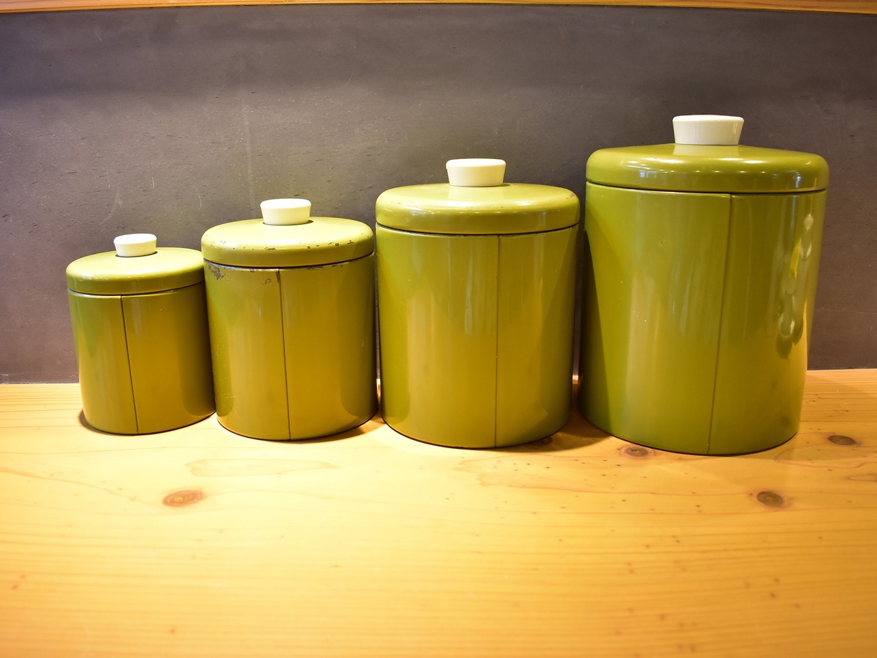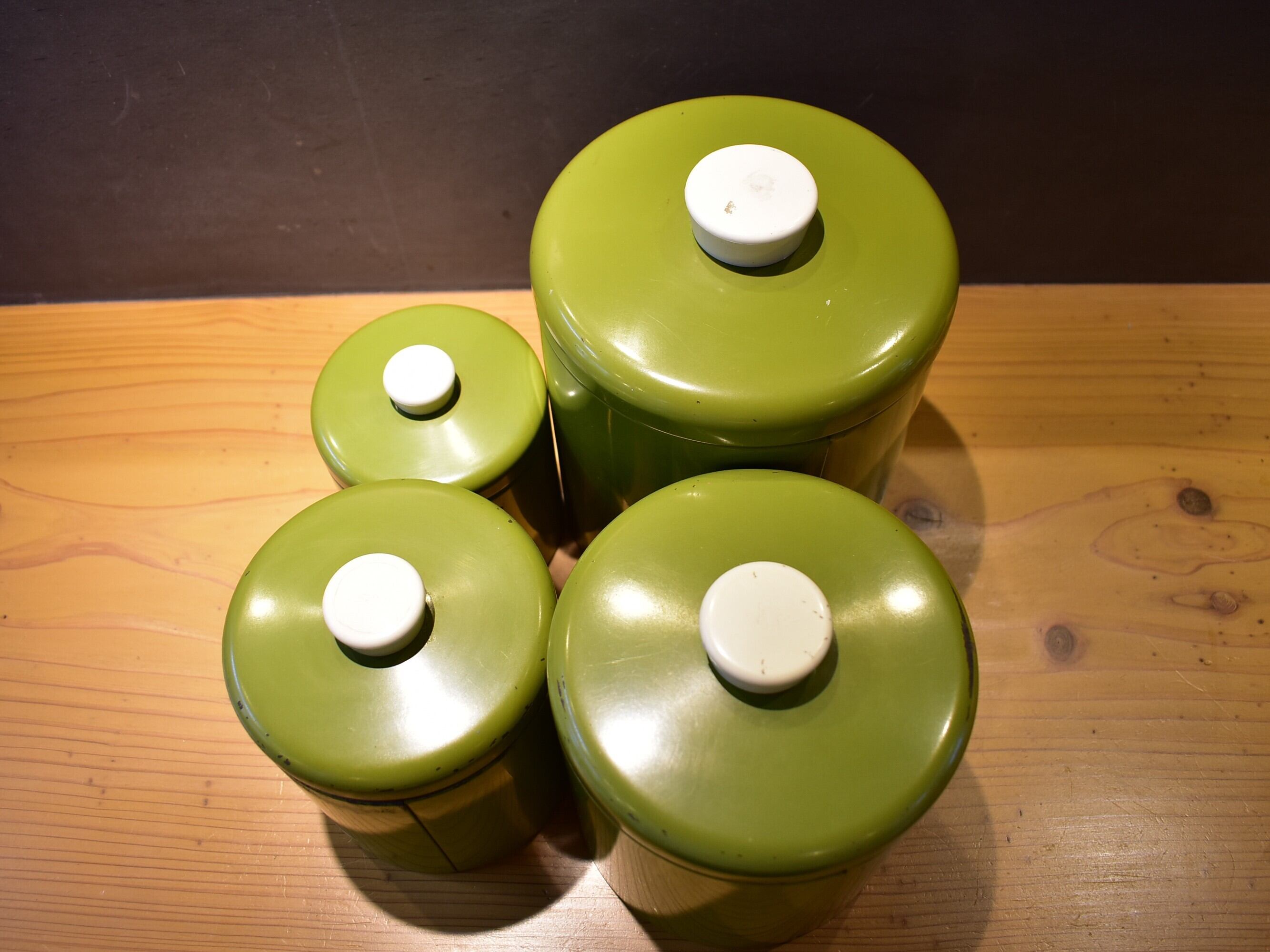 ネスト缶というのは大きな缶の中に順番に小さな缶がいくつか入っているものです。こちらの品はアメリカの老舗ペイント会社、ランスバーグのものです。現地でも海外でもコレクターが大変多く、4個そろっているのは稀少品です。ランスバーグの缶の特徴は、ハンドペイントの花柄。ベースの色に加え、レトロなデザインの花柄は時代を超えて人気です。